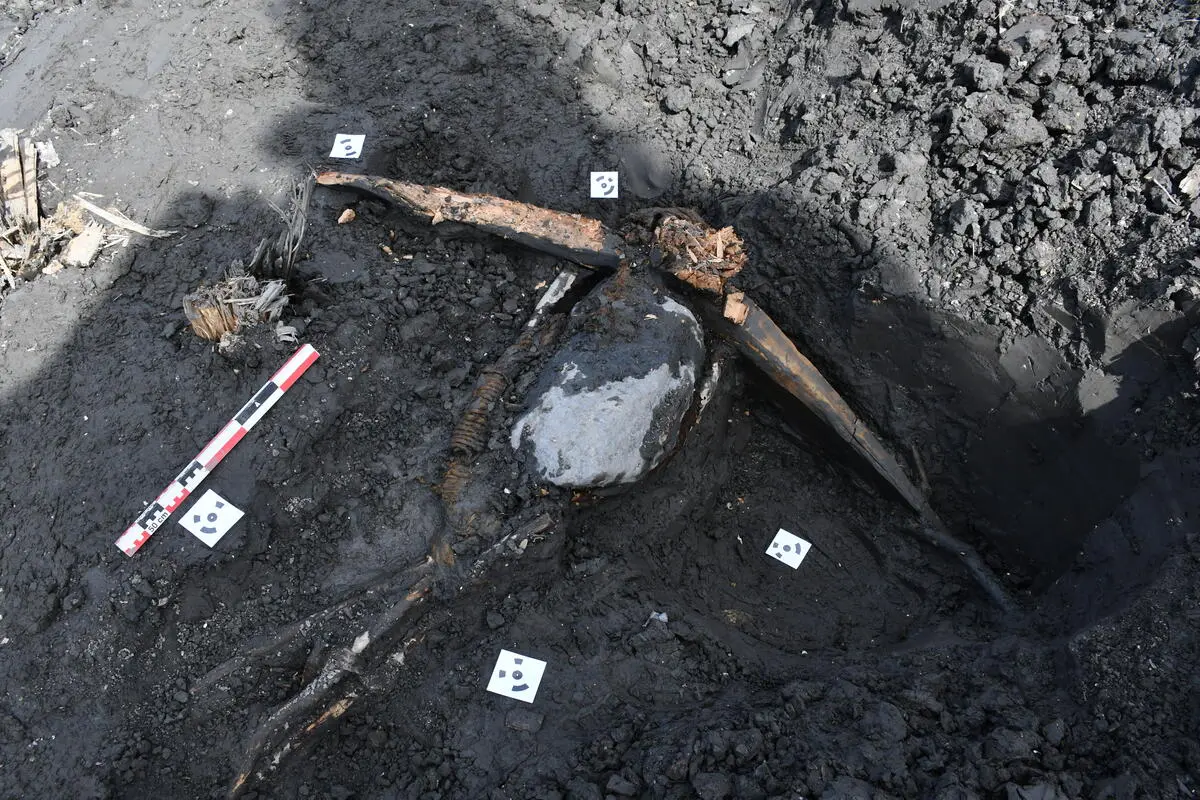 With just a single section left to dig in this area, we thought we had picked up a metal signal near a length of wood that looked like a handle, could it be an axe? It was carefully excavated but the metal signal disappeared, and the wooden handle revealed itself to be (dramatic pause) a stick. We gave up on the section leaving one lone archaeologist, Christian, to watch as the digger finished its work. Christian took a last sweep with the metal detector before giving the go ahead for the concrete to be poured, and there it was again, the metal signal. Fast forward through a lot of mud and confusion and we had finally found a lost iron anchor.