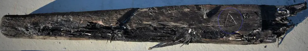 While it has been wonderful to find these killicks, we had begun to wonder: where have all of the lost iron anchors gotten to? Tantalisingly last week we began to find anchor stocks, one after the other in the same part of our excavation field and in the same soil layer so that we knew they dated to the same period, around the 14th century. On and around these wooden stocks we found thick rope. Many of the stocks were badly eaten by shipworm. But their function was clear, they were made of two heavy oak parts trenailed together with a rebate for the shank of an iron anchor. The iron parts of the anchors however were nowhere to be seen. It was some consolation when we found a beautiful owner’s mark on one of these stocks.