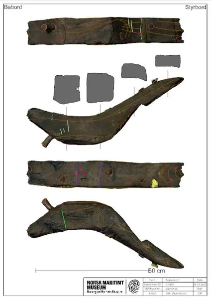Plantegning av båtfunn fra felt. Hver enkelt del blir dokumentert. Norsk Maritimt Museum/Rune Borvik