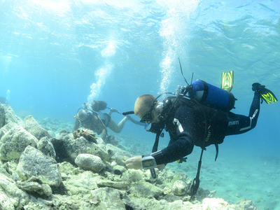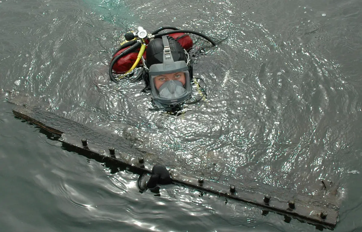 Diver surfacing with boat part Norsk Maritimt Museum/Jostein Gundersen