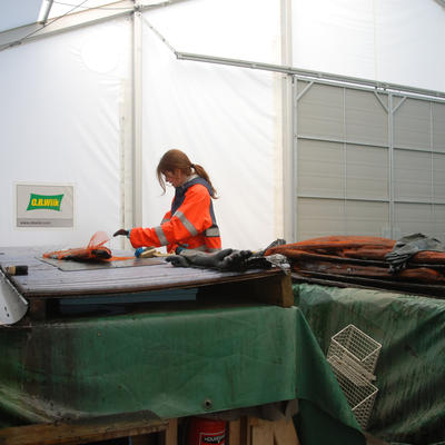 Archaeologist from the documentation lab cleaning boat parts. Norsk Maritimt Museum/Tori Falck - 2/2