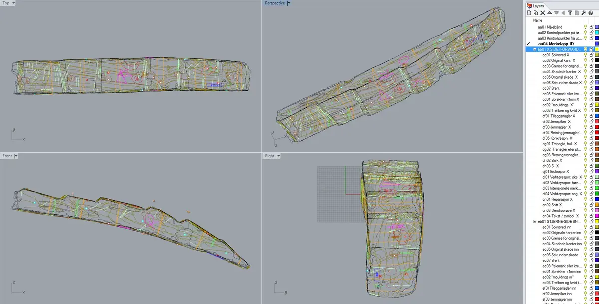 The archaeological section at the Norwegian Maritime Museum has been using FARO arms for the documentation of archaeological boat and ship remains since 2007. A FARO arm is a type of coordinate measuring machine (CMM). For the sake of simplicity, it can be described as an advanced digital pen that makes it possible to measure and record an object in three dimensions with high precision. The FARO arm is connected to a computer running Rhino3D, a computer aided design (CAD) program. These tools help rationalise any later reconstructions of the finds, whether as physical or digital models.