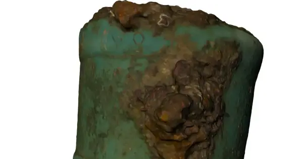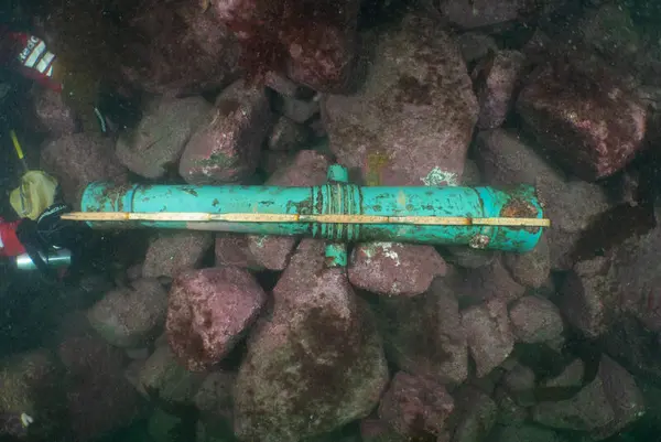 Upon arrival at the museum the cannon was scanned, photographed and measured before starting the conservation process. It is just under 120 cm long and weighs 90 kg. The bore diameter is between 75 and 76 mm. A "V" and an "o" are inscribed on the upper side of the cannon's rear end. In addition to this there is something resembling a cross inscribed in the same area, though this is partially covered by concretion. The cannon is covered by marine growth and concretion in some places, making some details difficult to discern at this stage. Hopefully, further treatment in the conservation lab will make some of these easier to see.