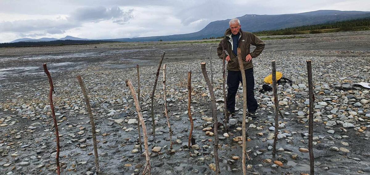 Fjellvandrer Reidar Marstein fant fiskefellene i Tesse. Her har han satt ned kjepper i sjøbunnen for å vise hvor den ene fangstbåsen har stått. FOTO: Trygve Hesthagen