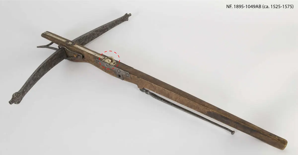 En armbrøst fra 1500-tallet, fra samlingen til Norsk Folkemuseum (Inventarnummer 1895-1049AB). Delen av armbrøsten som tilsvarer den vi har funnet på B8b, armbrøstnøtten, er markert med rød sirkel. Jon-Erik Faksvaag / Norsk Folkemuseum