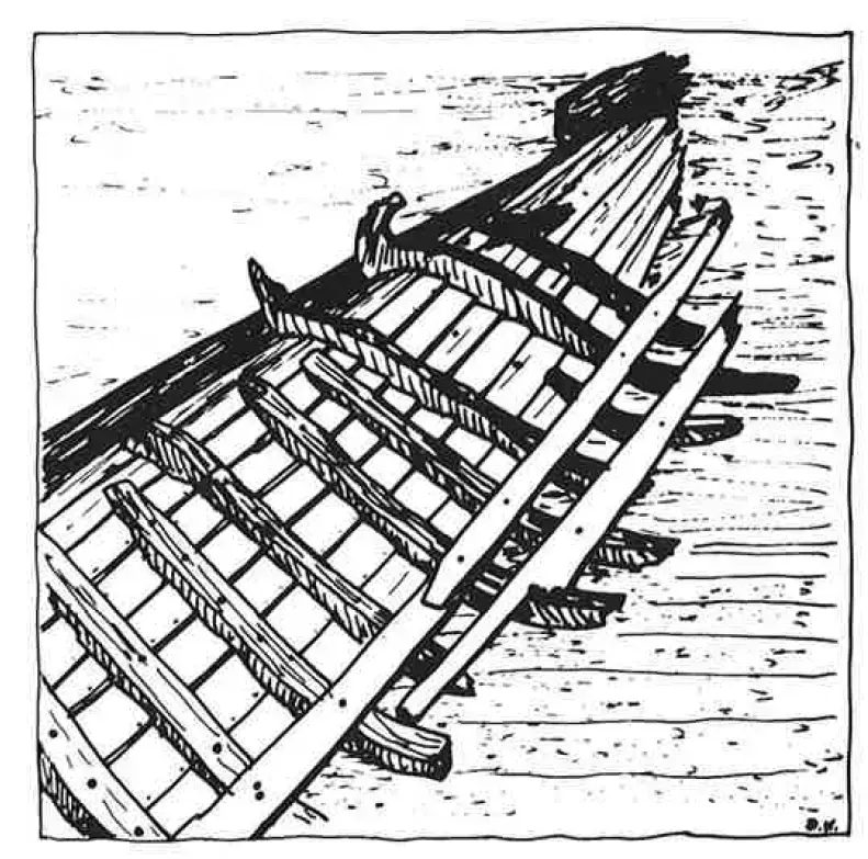 Hand drawing, made in 1986, of the Medieval ship Isegran 1. Dag Nævestad/Norwegian Maritime Museum