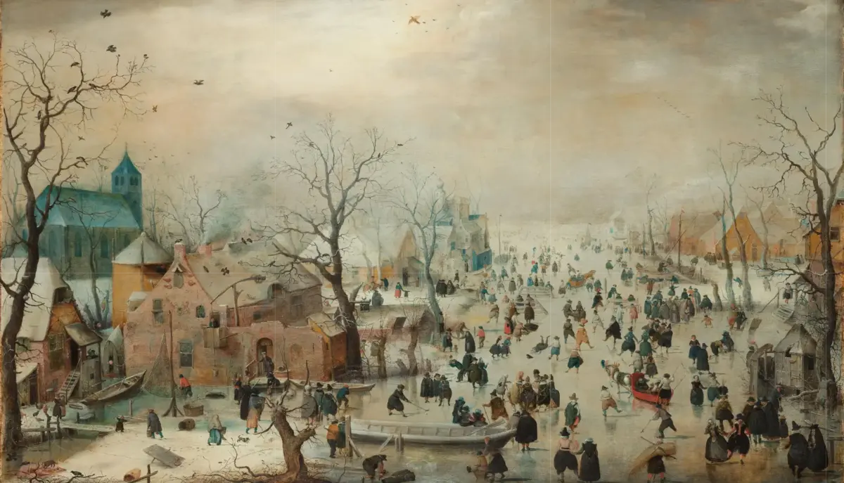 Vinterlandskap fra Nederland som viser hvor populært det var med skøyter. Winterlandschap met schaatsers. Hendrick Avercamp, ca. 1608 https://www.rijksmuseum.nl/nl/collectie/SK-A-1718