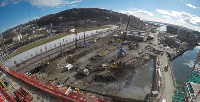 Fra utgravningen på Barcode-tomta i Oslo. Arkeologer, anleggsmaskiner, bolverk og båtvrak i skjønn forening. Norsk Maritimt Museum