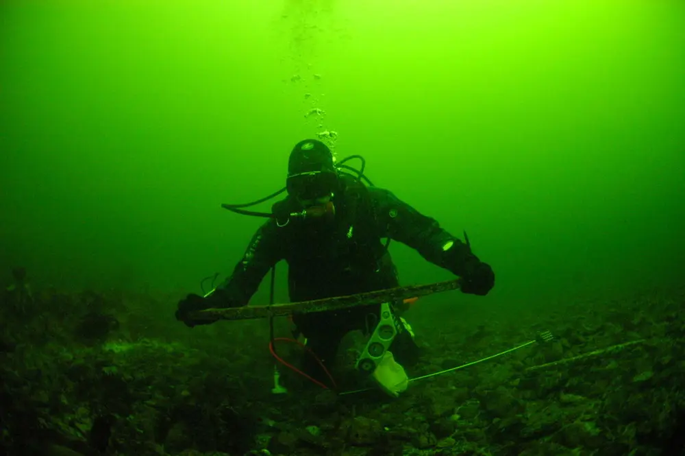 • Dykker med funn av brynestein på sjøbunnen. Norsk Maritimt Museum | Pål Nymoen