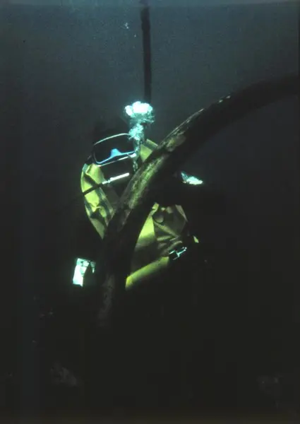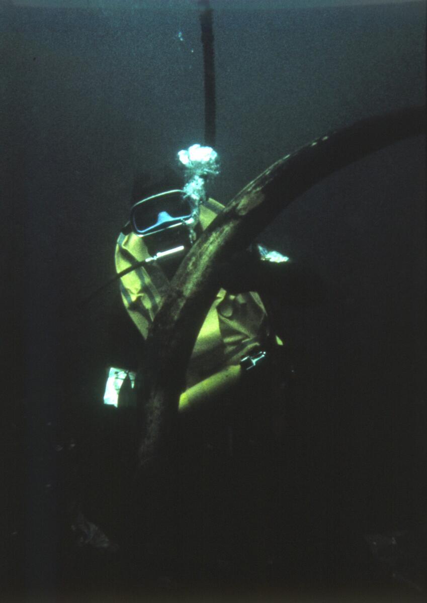 Dykker med ene elefanttann under utgravingen av slaveskipet 'Fredensborg' i 1975 Norsk Maritimt Museum