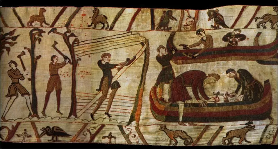 Utsnitt fra Bayeux-teppet fra ca 1070. Teppet fremstiller Vilhelm Erobrerens invasjon av England og slaget ved Hastings i 1066. I en båtbyggerscene vises en mann som «teljer» bord som skal brukes i skipene (ca. midt i bilde). Denne øksen er svært lik den vi har funnet. Illustrasjon fra Store Norske Leksikon
